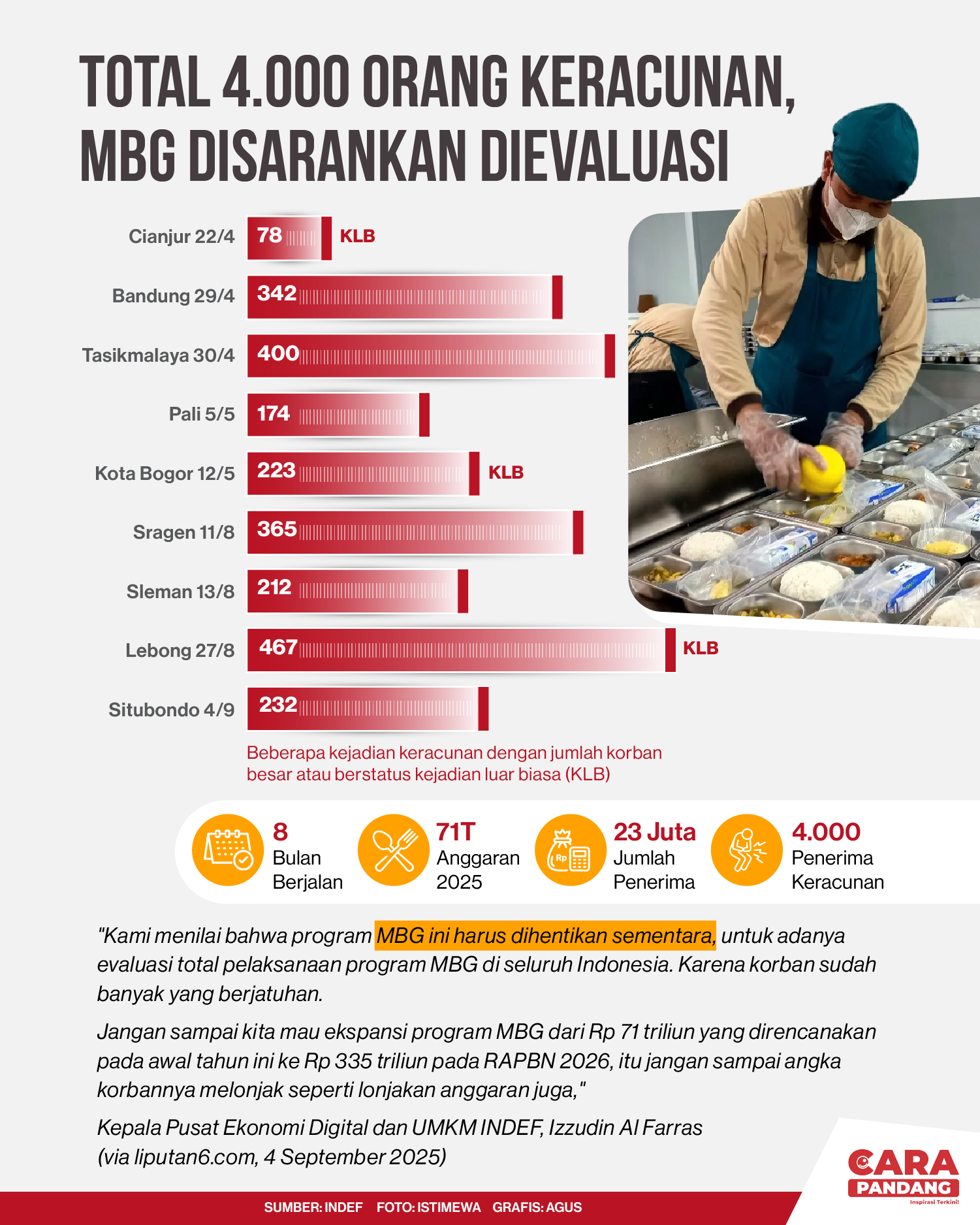 Beranda Infografis 4.000 Orang Keracunan MBG Infografis 4.000 Orang Keracunan MBG Penulis Amira Izzati - 19 September 2025 11:20 0 4.000 Orang Keracunan MBG Tags Berita Sebelumnya Starmer dan Trump Sepakat Dorong Perdamaian di Jalur Gaza Berita Berikutnya Hasil Sidang MKD DPR RI LEAVE A REPLY Cancel reply Comment: Please enter your comment! Name:* Please enter your name here Email:* You have entered an incorrect email address! Please enter your email address here Website: Save my name, email, and website in this browser for the next time I comment. Berita Teratas Cara Tidur Ala Rasulullah, Bagus untuk Kesehatan! Piala Dunia U-17, Nova Arianto Berharap Qatar Kembali Bersahabat Kiat Mempertahankan Nutrisi Makanan Saat Memasak Menggunakan Microwave Hadapi Liverpool di UCL, Xabi Alonso Sebut Laga Besar dan Klasik Pabrik Mobil Terbang Pertama di Dunia Mulai Uji Coba Produksi di China Selatan Berita Terkait Berita Terkait Hasil Sidang MKD DPR RI Maliq - 06 November 2025 11:34 Biaya Haji 2026 Turun Maliq - 06 November 2025 11:32 Indonesia Para Badminton, Tradisi Juara Umum Berlanjut Maliq - 05 November 2025 09:37 Jadwal Indonesia di Piala Dunia U17 2025 Maliq - 29 Oktober 2025 13:24
