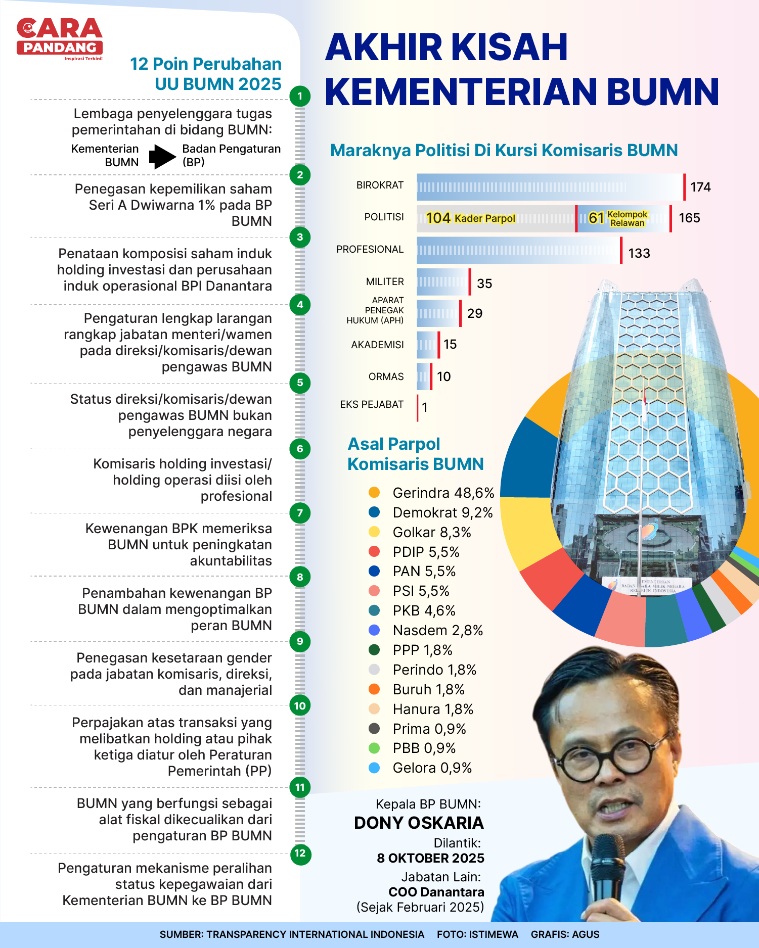 Beranda Infografis Akhir Kisah Kementerian BUMN Infografis Akhir Kisah Kementerian BUMN Penulis Amira Izzati - 13 Oktober 2025 12:48 0 Akhir Kisah Kementerian BUMN Tags Berita Sebelumnya Polisi Tangkap Pelaku Pengeroyokan Ojol di Jakut Berita Berikutnya Otoritas Meteorologi: Vietnam Diterjang Banjir Terparah dalam 50 Tahun LEAVE A REPLY Cancel reply Comment: Please enter your comment! Name:* Please enter your name here Email:* You have entered an incorrect email address! Please enter your email address here Website: Save my name, email, and website in this browser for the next time I comment. Berita Teratas FIBA: Transfer Pemain Bola Basket Internasional Meningkat Anak-Anak di Gaza Hadapi Trauma Tak Terbayangkan pada Hari Anak Sedunia Tentang Dualisme Kepengurusan Cabang Olahraga, Erick Thohir: Akan Kita Selesaikan Indonesia.md Hadirkan Inovasi Penanganan Jantung Berbasis Teknologi Lionsgate Siapkan Film 'Now You See Me 4' Berita Terkait Berita Terkait Penyaluran Tunjangan Guru ASN Capai 92 Persen Zoel Rachman - 27 November 2025 08:56 Insentif untuk Guru non-ASN dan Nonformal Maliq - 26 November 2025 15:44 Putusan Hakim Tidak Bulat, 3 Eks Direktur ASDP Divonis Penjara Zoel Rachman - 23 November 2025 22:32 Kuota Haji 2026 per Provinsi, Masa Tunggu 26 Tahun Zoel Rachman - 23 November 2025 09:37