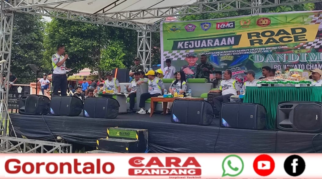 POHUWATO, CARAPANDANG - Suasana meriah mewarnai Kejuaraan Road Race Dandim Pohuwato Cup Championship 2025 yang berlangsung di kompleks perkantoran Block Plan, Kecamatan Marisa, Kabupaten Pohuwato, Sabtu (27/9/2025).