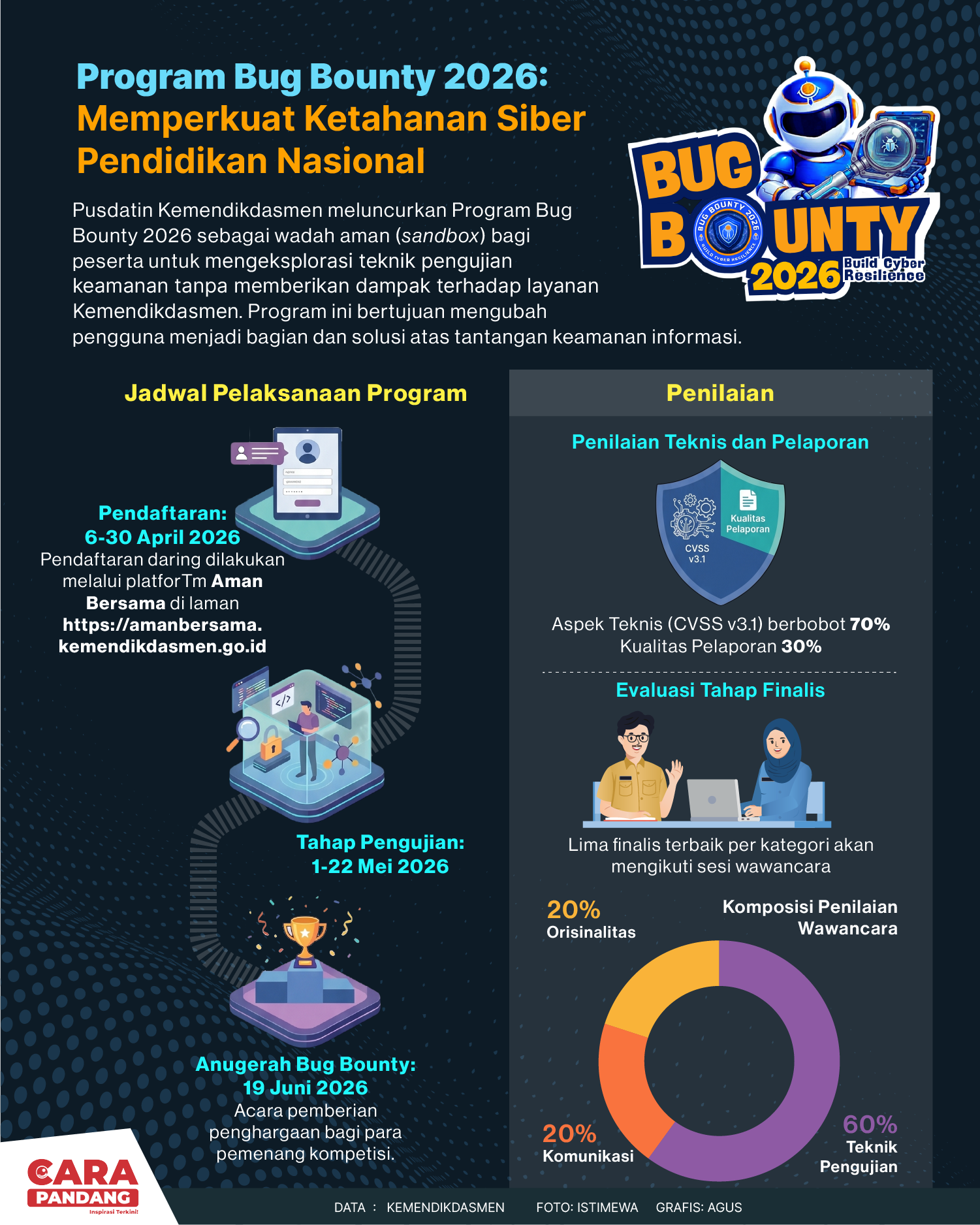 Beranda Infografis Program Bug Bounty 2026, Perkuat Ketahanan Siber Pendidikan Indonesia Infografis Program Bug Bounty 2026, Perkuat Ketahanan Siber Pendidikan Indonesia Penulis Amira Izzati - 15 April 2026 21:44 0 Prgram Bug Bounty 2026, Perkuat Ketahanan Siber Pendidikan Indonesia Tags Berita Sebelumnya Komnas Perempuan: Desak Kasus Dugaan Pelecehan di FH UI diproses Jalur Hukum Berita Berikutnya Gubernur Mahyeldi Hadiri Dialog Menko Polkam, Perkuat Sinergi Pusat-Daerah Jaga Stabilitas Nasional LEAVE A REPLY Cancel reply Comment: Please enter your comment! Name:* Please enter your name here Email:* You have entered an incorrect email address! Please enter your email address here Website: Save my name, email, and website in this browser for the next time I comment. Berita Teratas Cara Tidur Ala Rasulullah, Bagus untuk Kesehatan! Mengunjungi Museum Lokananta di Surakarta, Jawa Tengah Pengamat: Melihat Kebijakan WFH Pada Hari Jumat Sebagai langkah positif Biografi B.J Habibie: Bapak Teknologi Indonesia yang Hebat dan Mengharumkan Nama Bangsa Chrisye: Sang Legenda Musik Indonesia,Inspiratif dan Tak Pernah Padam Ditelan Waktu Berita Terkait Berita Terkait Rapor Biru Kinerja Kabinet Merah Putih Maliq - 15 April 2026 14:46 Makin Ugal-ugalan Kini BGN Gelontorkan 6,9 Miliar untuk Belanja Kaos Kaki Zoel Rachman - 13 April 2026 07:53 Wajah Baru PP Tunas: Garda Terdepan Perlindungan Anak Indonesia Zoel Rachman - 31 Maret 2026 09:42 MBG 5 Hari Sepekan Masih Wacana Maliq - 30 Maret 2026 11:49