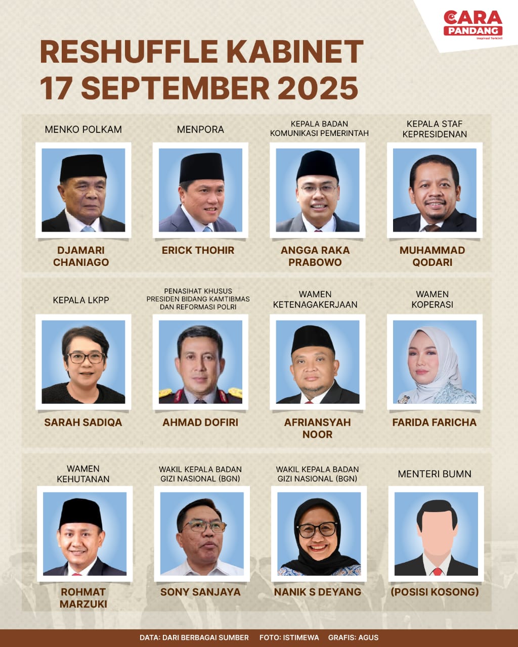 Beranda Infografis Reshuffle Kabinet 17 September 2025 Infografis Reshuffle Kabinet 17 September 2025 Reshuffle Kabinet 17 September 2025. Penulis Edo Soeryadi - 18 September 2025 18:17 0 CARAPANDANG.COM - Reshuffle Kabinet 17 September 2025. Tags Infografik Reshuffle Kabinet 2025 Berita Sebelumnya Dinas Keamanan Rusia Gagalkan Upaya Pembunuhan di St. Petersburg Berita Berikutnya Terjerat OTT KPK, Segini Harta Gubernur Riau LEAVE A REPLY Cancel reply Comment: Please enter your comment! Name:* Please enter your name here Email:* You have entered an incorrect email address! Please enter your email address here Website: Save my name, email, and website in this browser for the next time I comment. Berita Teratas Cara Tidur Ala Rasulullah, Bagus untuk Kesehatan! Kereta Api di Daop 7 Ikut Terdampak Akibat Banjir di Semarang Korut Uji Coba Rudal Jelajah Jelang Kunjungan Trump ke Korsel Purbaya Ancam Pelaku Import Pakaian Bekas Ilegal Mensos: Generasi Muda Indonesia Jangan Takut Bermimpi Besar Berita Terkait Berita Terkait Jadwal Indonesia di Piala Dunia U17 2025 Maliq - 29 Oktober 2025 13:24 Whoosh Indonesia vs Land Brigde Arab Saudi Maliq - 27 Oktober 2025 12:18 Muhammadiyah Masuk Dalam 10 Organisasi Agama Terkaya di Dunia Maliq - 24 Oktober 2025 11:12 Mewujudkan Pendidikan Berkualitas Maliq - 24 Oktober 2025 07:38