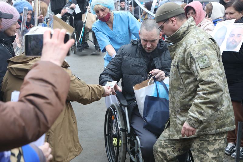 Orang-orang menunggu kerabat mereka yang dibebaskan dari penahanan di sebuah rumah sakit di Ukraina utara pada 11 April 2026. (Carapandang/Xinhua/Peter Druk)