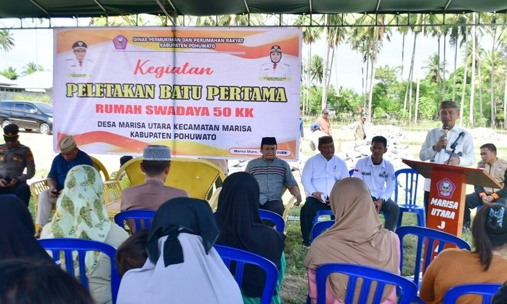 Pembangunan 50 unit rumah yang bersumber dari DAK dan APBD Pohuwato ditandai dengan peletakan batu pertama oleh Bupati Pohuwato, Saipul A. Mbuinga bersama Kadis Perkim, Fadli Sanad, Kadis Perindagkop dan UKM, Ibrahim Kiraman, dan Camat Marisa, Mohamad Huntoyungo, Jum’at, (15/03/2024).