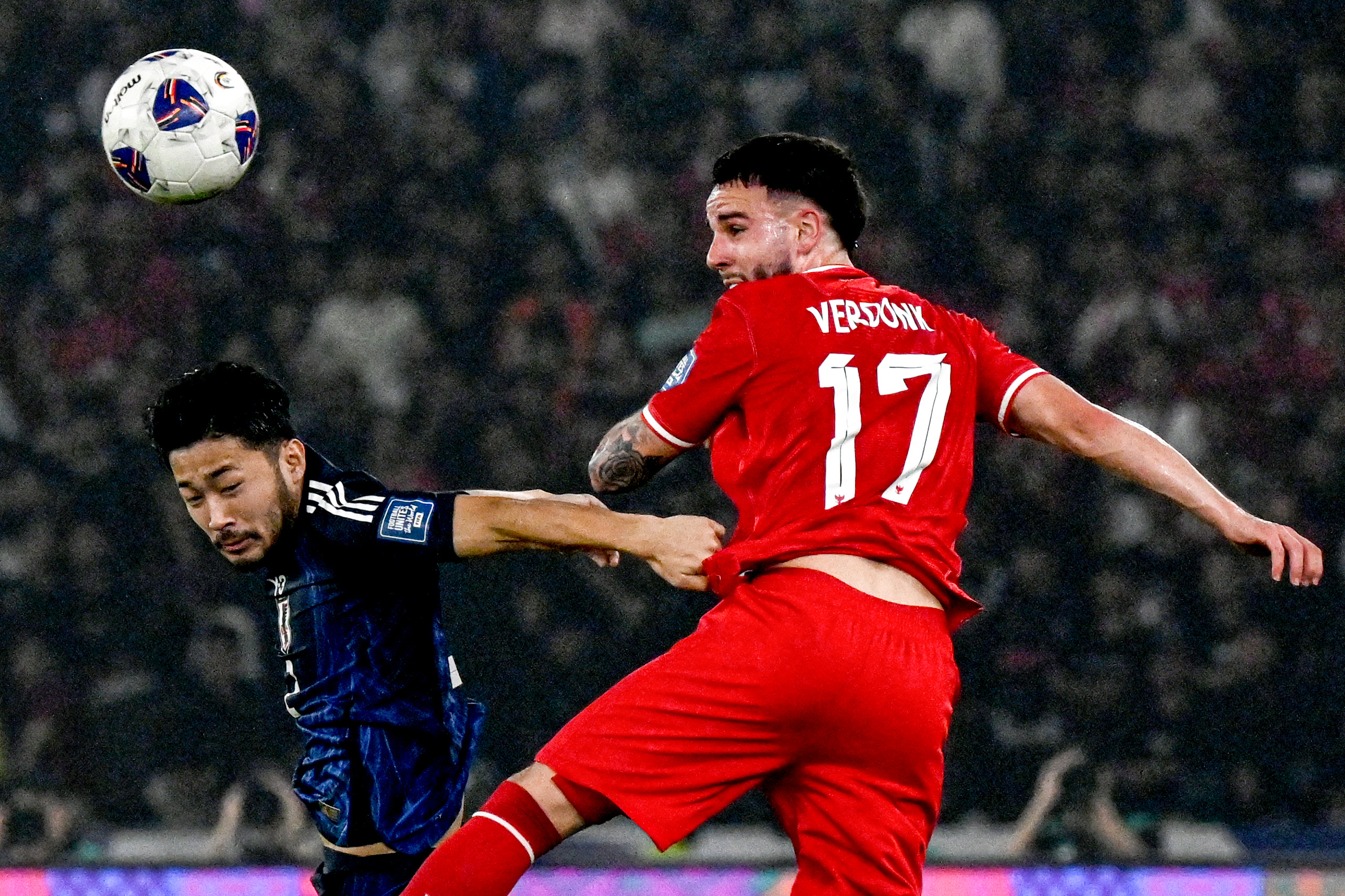 Pemain Jepang Ogawa Koki (kiri) beraksi dalam pertandingan Grup C Kualifikasi Piala Dunia FIFA 2026 Zona Asia antara Indonesia melawan Jepang di Stadion Gelora Bung Karno (GBK) di Jakarta pada 15 November 2024. (Xinhua/Agung Kuncahya B.)
