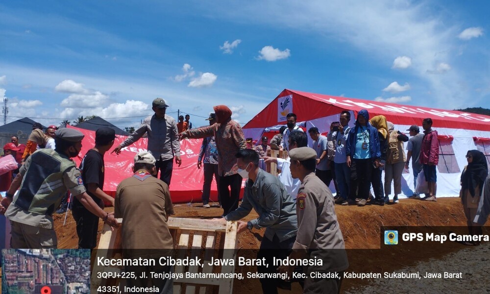 Mensos bersama tim memasang tenda bagi masyarakat terdampak longsor di Kabupaten Sukabumi. Selain tenda, bantuan logistik Kementerian Sosial sudah lebih dahulu