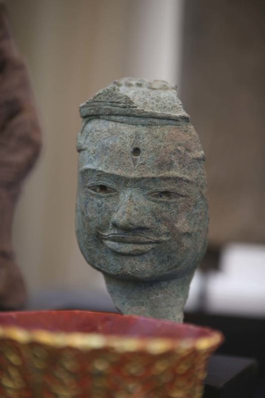 Sebuah patung kuno Khmer dipamerkan di Istana Perdamaian di Phnom Penh, Kamboja, pada 22 Agustus 2024. (Xinhua/Rani)