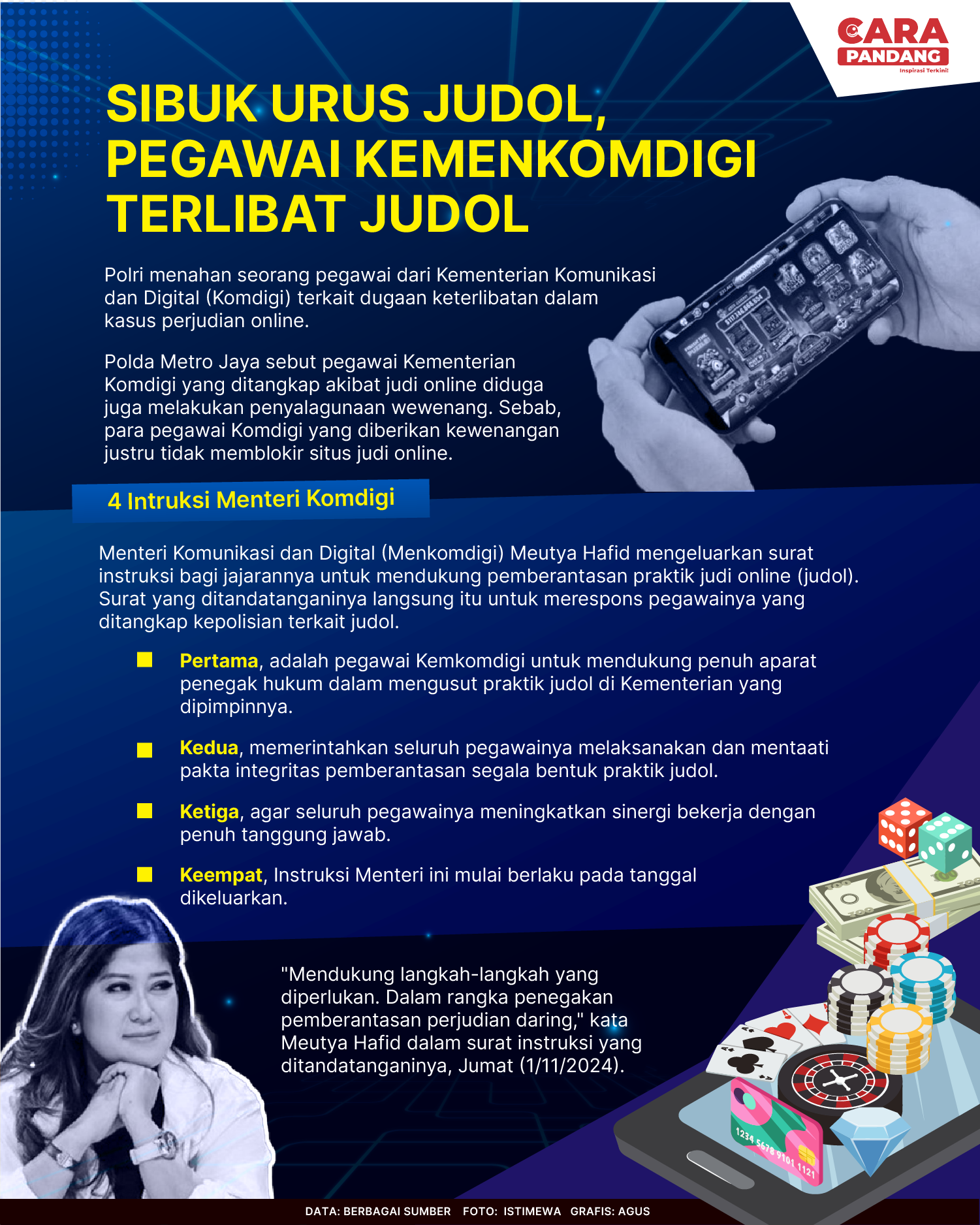 CARAPANDANG - Menkomdigi Meutya Hafid menegaskan pihaknya akan bersih-bersih internal setelah pegawai di kementeriannya diamankan terkait kasus judi online. Meutya juga sudah membuat pakta integritas agar semua jajaran di Komdigi melawan judi online.