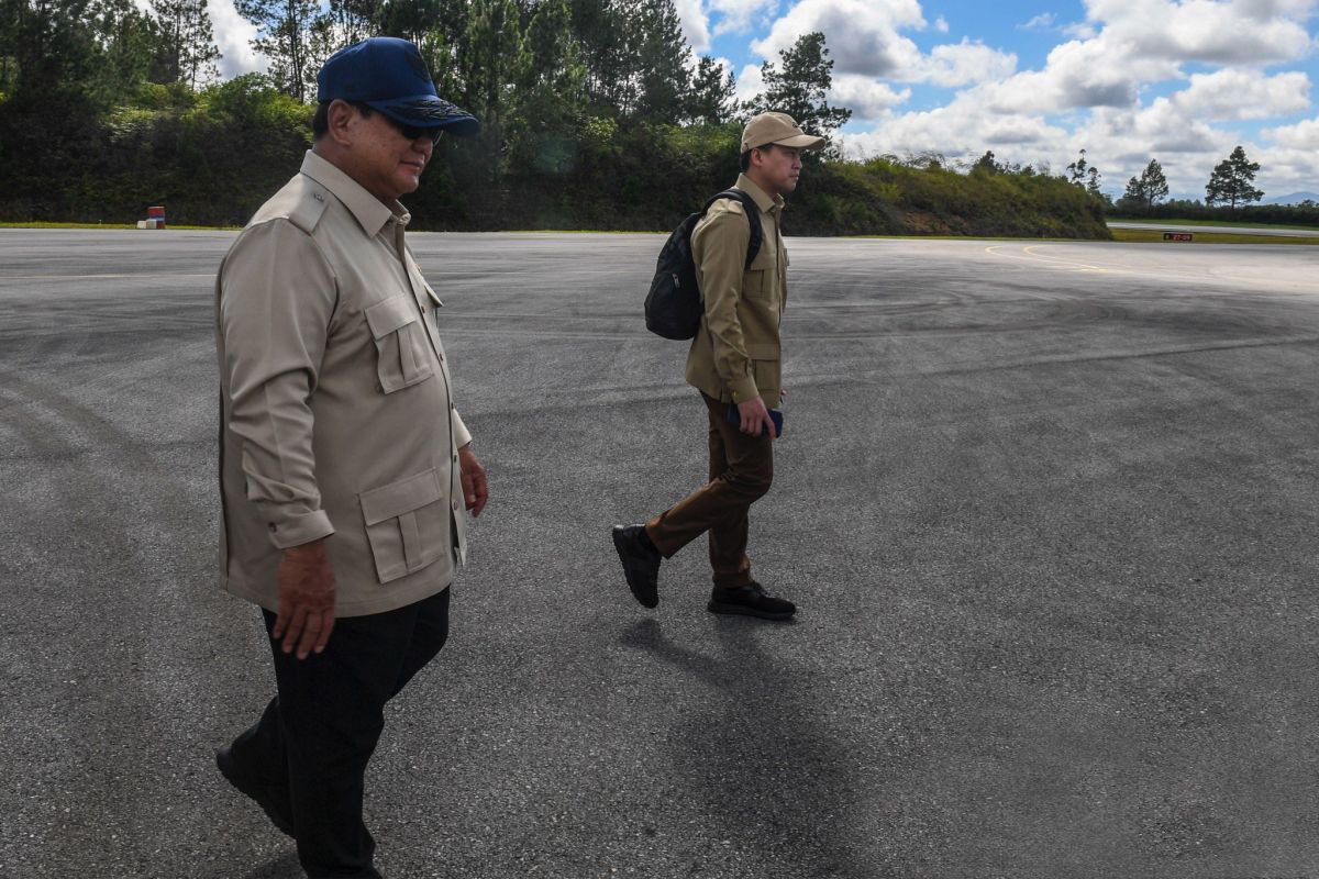 Presiden Prabowo turun dari pesawat kepresidenan PK-GRD sekitar pukul 10.30 WIB, setelah pesawat mendarat pukul 10.21 WIB.