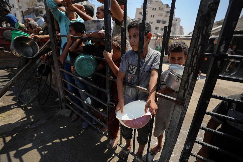 Warga Palestina menunggu untuk menerima makanan gratis di sebuah kamp pengungsi di Gaza City barat daya pada 24 Agustus 2025. (Carapandang/Xinhua/Rizek Abdeljawad)