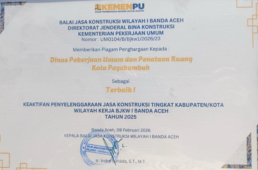 PAYAKUMBUH, CARAPANDANG - Dinas Pekerjaan Umum dan Penataan Ruang (PUPR) Kota Payakumbuh kembali menorehkan prestasi membanggakan dengan meraih Penghargaan Terbaik I pada Penilaian Kinerja dan Pembinaan Organisasi Perangkat Daerah (OPD) Sub-Urusan Jasa Konstruksi di wilayah kerja Balai Jasa Konstruksi Wilayah I Banda Aceh, Senin (09/02/2026).