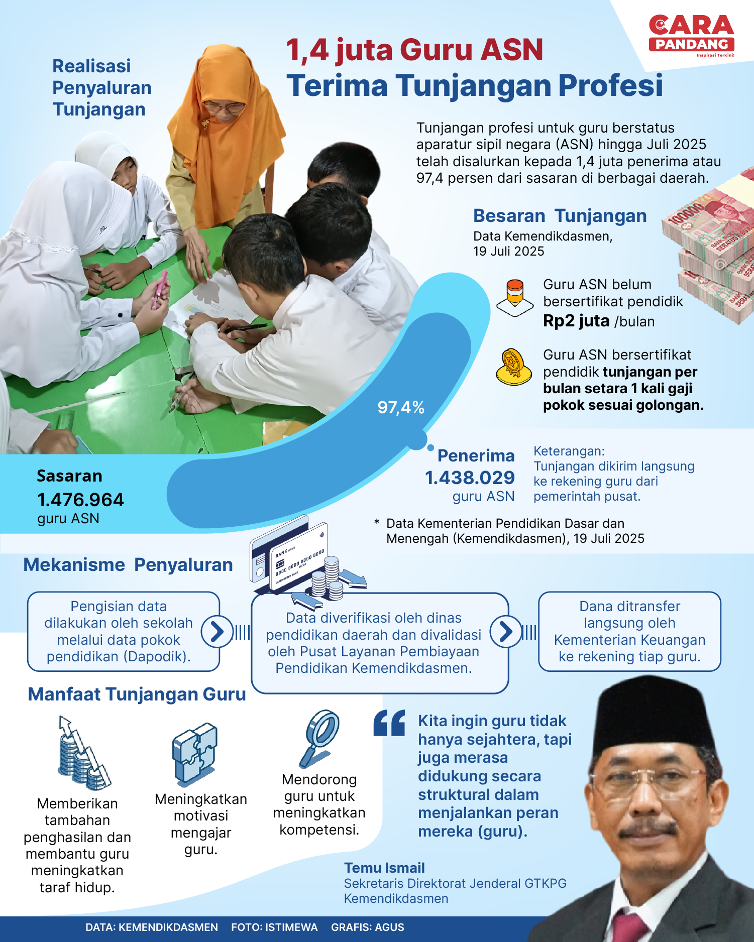 Beranda Infografis 1,4 Juta Guru ASN Terima Tunjangan Profesi Infografis 1,4 Juta Guru ASN Terima Tunjangan Profesi 1,4 Juta Guru ASN Terima Tunjangan Profesi. Penulis Edo Soeryadi - 24 Juli 2025 05:45 0 CARAPANDANG.COM - Guru ASN Terima Tunjangan Profesi. Tags Mendikdasmen AbdulMu'ti GTK ASN Tunjanga Profesi Berita Sebelumnya BNN dan Pemkab Solok Gelar Workshop Relawan Antinarkotika Nagari Bersinar di Koto Laweh Berita Berikutnya Hamas Bantah Tuduhan AS Soal Perjarahan Truk Bantuan di Gaza LEAVE A REPLY Cancel reply Comment: Please enter your comment! Name:* Please enter your name here Email:* You have entered an incorrect email address! Please enter your email address here Website: Save my name, email, and website in this browser for the next time I comment. Berita Teratas Kereta Api di Daop 7 Ikut Terdampak Akibat Banjir di Semarang Korut Uji Coba Rudal Jelajah Jelang Kunjungan Trump ke Korsel Purbaya Ancam Pelaku Import Pakaian Bekas Ilegal Mensos: Generasi Muda Indonesia Jangan Takut Bermimpi Besar Israel akan Cabut "Situasi Khusus" di Wilayah Selatan untuk Kali Pertama sejak Oktober 2023 Berita Terkait Berita Terkait Jadwal Indonesia di Piala Dunia U17 2025 Maliq - 29 Oktober 2025 13:24 Whoosh Indonesia vs Land Brigde Arab Saudi Maliq - 27 Oktober 2025 12:18 Muhammadiyah Masuk Dalam 10 Organisasi Agama Terkaya di Dunia Maliq - 24 Oktober 2025 11:12 Mewujudkan Pendidikan Berkualitas Maliq - 24 Oktober 2025 07:38