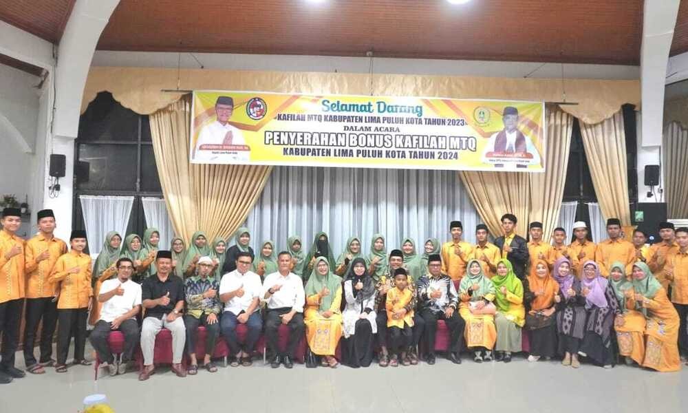 LIMA PULUH KOTA, CARAPANDANG - 71 Kafilah Musabaqah Tilawatil Quran (MTQ) Kabupaten Limapuluh Kota yang berprestasi pada MTQ Nasional ke-40 tingkat Sumatera Barat di Kabupaten Solok Selatan akhirnya menerima bonus yang diberikan oleh Pemerintah Kabupaten Limapuluh Kota.