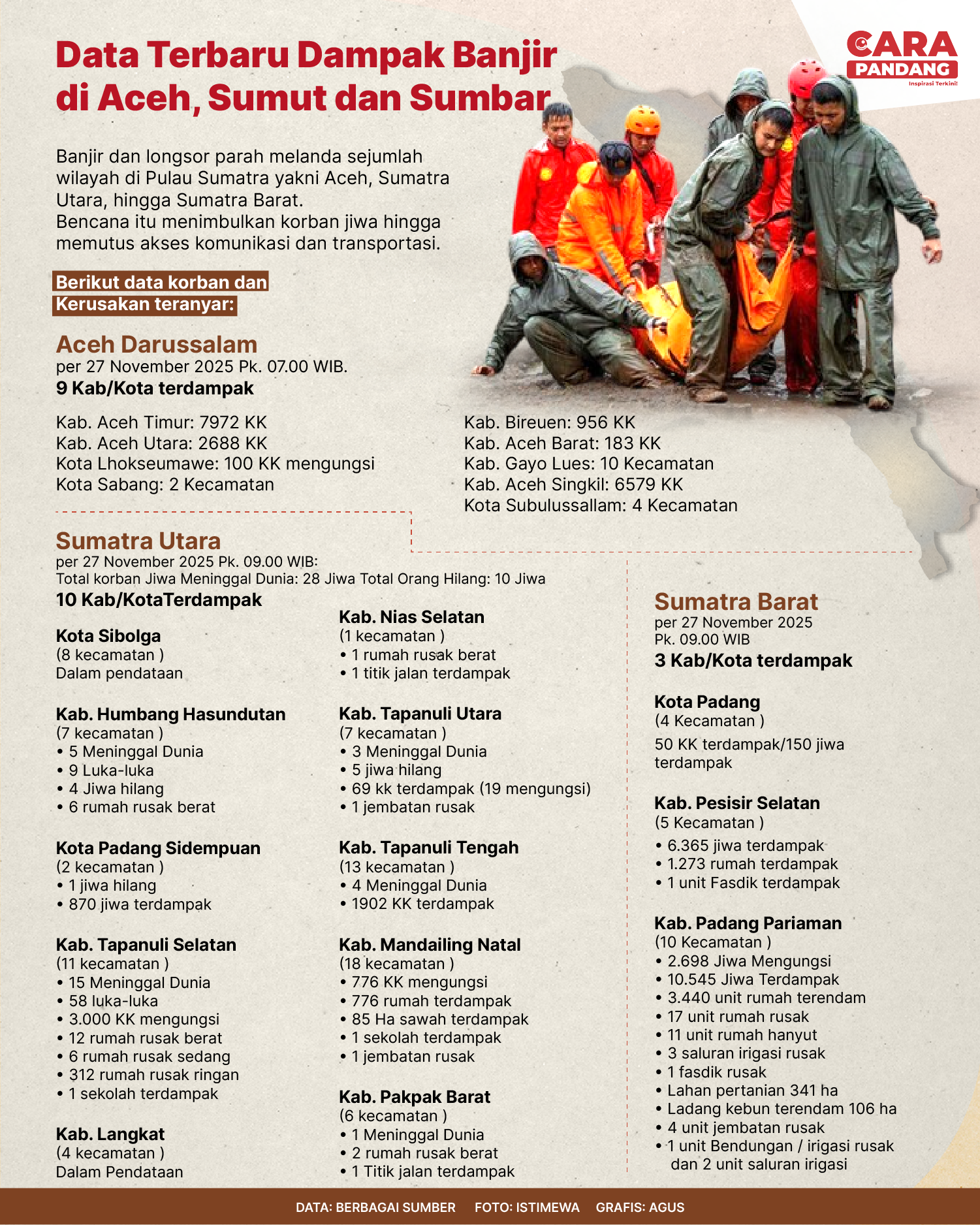 Beranda Infografis Dampak Banjir Aceh, Sumut dan Sumbar Infografis Dampak Banjir Aceh, Sumut dan Sumbar Data Terbaru Dampak Banjir. Penulis Edo Soeryadi - 05 Desember 2025 08:47 0 CARAPANDANG.COM - Data Terbaru Dampak Banjir. Tags Infografis Banjir Aceh Sumut Sumbar Berita Sebelumnya Gerai Samsat Keliling Tersedia di 14 Wilayah Jadetabek Berita Berikutnya MUI Nilai 'Dewan Perdamaian' Bentukan Trump Bentuk Nyata Langkah Neo Kolonialisme LEAVE A REPLY Cancel reply Comment: Please enter your comment! Name:* Please enter your name here Email:* You have entered an incorrect email address! Please enter your email address here Website: Save my name, email, and website in this browser for the next time I comment. Berita Teratas A Message for Sumatra’s Reforestation: Lessons Learned from the Destroyed Forest Atasi Batuk Berdahak Dengan 11 Obat Alami yang Aman dan Ampuh BNN Bongkar Pabrik Gelap Narkoba Jaringan Global di Apartemen Jaksel HPN 2026 Dorong Kearifan Lokal Badui Dikenal Hingga Mancanegara Kaki Bengkak, Dingin, atau Kram Bisa jadi Indikasi Masalah Kesehatan Berita Terkait Berita Terkait Distribusi Bantuan Banjir Sumatra Lewat Udara Maliq - 06 Desember 2025 14:16 Daftar Dosa Korupsi Netanyahu Zoel Rachman - 04 Desember 2025 12:52 Kutipan Pidato Hari Guru Nasional 2025 Maliq - 28 November 2025 12:12 Penyaluran Tunjangan Guru ASN Capai 92 Persen Zoel Rachman - 27 November 2025 08:56