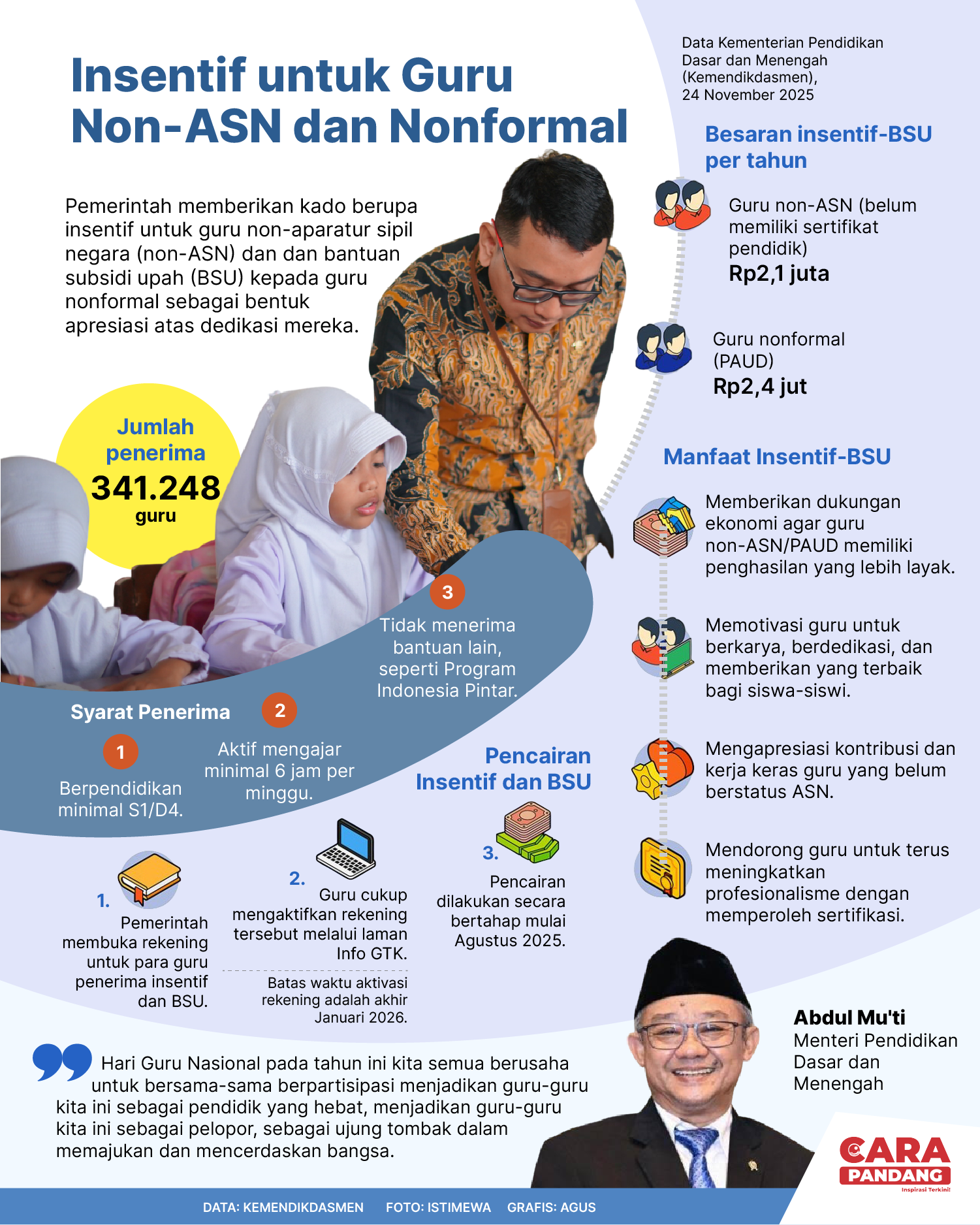 Beranda Infografis Insentif untuk Guru non-ASN dan Nonformal Infografis Insentif untuk Guru non-ASN dan Nonformal Penulis Amira Izzati - 26 November 2025 15:44 0 Insentif untuk Guru non-ASN dan Nonformal Tags Berita Sebelumnya Pemprov Sumbar Imbau Warga Tetap Waspada, BMKG Perpanjang Prakiraan Cuaca Ekstrem hingga 29 November Berita Berikutnya Semeru Alami 16 kali Erupsi, Letusan Tertinggi Capai 1.100 meter LEAVE A REPLY Cancel reply Comment: Please enter your comment! Name:* Please enter your name here Email:* You have entered an incorrect email address! Please enter your email address here Website: Save my name, email, and website in this browser for the next time I comment. Berita Teratas Janganlah Hanya Ingin dan Berharap. Wujudkanlah Gagasan Anda! Lakukan 6 Hal Ini Jika Melancong ke Negara dengan Kasus Influenza Tinggi Enam Manfaat Cuci Muka dengan Air Es untuk Kesehatan Wajah Mengintip Aktivitas Pelatihan Anjing Pemandu di Richmond, Kanada Liga Champions: Arsenal Sempurna, Liverpool dan Inter Kalah Berita Terkait Berita Terkait Kutipan Pidato Hari Guru Nasional 2025 Maliq - 28 November 2025 12:12 Penyaluran Tunjangan Guru ASN Capai 92 Persen Zoel Rachman - 27 November 2025 08:56 Putusan Hakim Tidak Bulat, 3 Eks Direktur ASDP Divonis Penjara Zoel Rachman - 23 November 2025 22:32 Kuota Haji 2026 per Provinsi, Masa Tunggu 26 Tahun Zoel Rachman - 23 November 2025 09:37