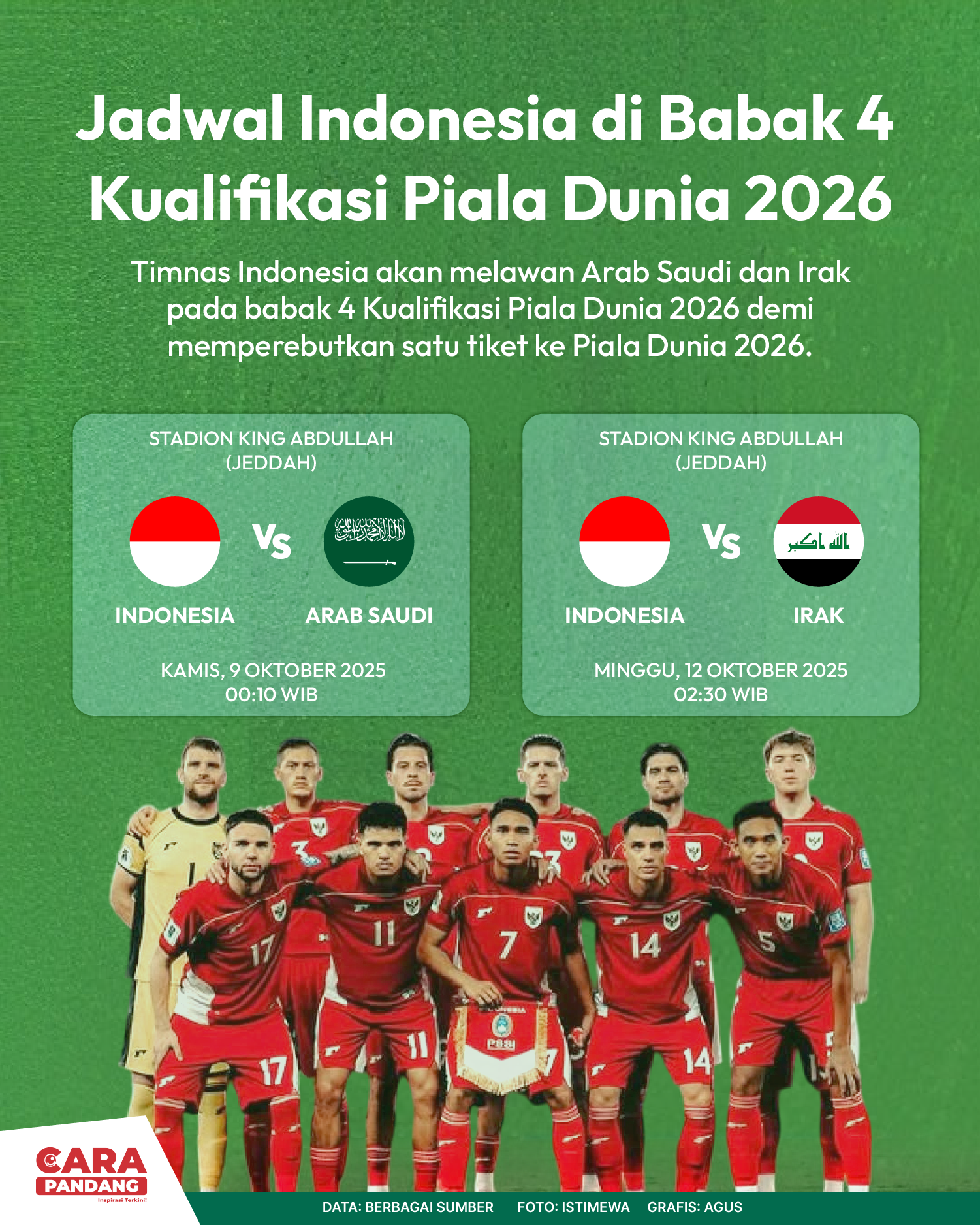 Beranda Infografis Jadwal Babak 4 Kualifikasi Piala Dunia 2026 Infografis Jadwal Babak 4 Kualifikasi Piala Dunia 2026 Penulis Amira Izzati - 18 September 2025 06:58 0 Jadwal Babak 4 Kualifikasi Piala Dunia 2026 Tags Berita Sebelumnya Tebarkan Kebaikan, Puncak HUT PMI ke-80 di Payakumbuh Berlangsung Meriah Berita Berikutnya Hamas Bantah Tuduhan AS Soal Perjarahan Truk Bantuan di Gaza LEAVE A REPLY Cancel reply Comment: Please enter your comment! Name:* Please enter your name here Email:* You have entered an incorrect email address! Please enter your email address here Website: Save my name, email, and website in this browser for the next time I comment. Berita Teratas Kereta Api di Daop 7 Ikut Terdampak Akibat Banjir di Semarang Korut Uji Coba Rudal Jelajah Jelang Kunjungan Trump ke Korsel Purbaya Ancam Pelaku Import Pakaian Bekas Ilegal Mensos: Generasi Muda Indonesia Jangan Takut Bermimpi Besar Israel akan Cabut "Situasi Khusus" di Wilayah Selatan untuk Kali Pertama sejak Oktober 2023 Berita Terkait Berita Terkait Jadwal Indonesia di Piala Dunia U17 2025 Maliq - 29 Oktober 2025 13:24 Whoosh Indonesia vs Land Brigde Arab Saudi Maliq - 27 Oktober 2025 12:18 Muhammadiyah Masuk Dalam 10 Organisasi Agama Terkaya di Dunia Maliq - 24 Oktober 2025 11:12 Mewujudkan Pendidikan Berkualitas Maliq - 24 Oktober 2025 07:38