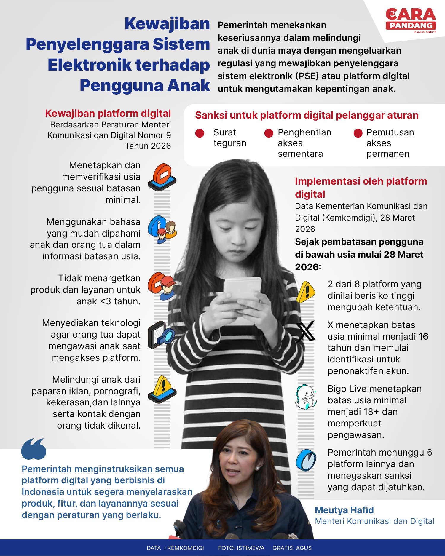 Beranda Infografis Kewaijiban PSE Terhadap Pengguna Anak Infografis Kewaijiban PSE Terhadap Pengguna Anak Penulis Amira Izzati - 30 Maret 2026 11:15 0 Kewaijiban PSE Terhadap Pengguna Anak Tags Berita Sebelumnya Trump: AS telah Ambil Langkah untuk Kuasai Selat Hormuz Berita Berikutnya Pramono Anung Menyatakan Segera Membuat Peraturan Turunan PP Tunas LEAVE A REPLY Cancel reply Comment: Please enter your comment! Name:* Please enter your name here Email:* You have entered an incorrect email address! Please enter your email address here Website: Save my name, email, and website in this browser for the next time I comment. Berita Teratas Kisah Amsal, Videografer Yang Didakwa Kasus Korupsi di Karo Tips Hidup Sehat Agar Bebas Penyakit Eropa Saksikan Gelombang Unjuk Rasa Menentang Serangan AS-Israel terhadap Iran Salah Akan Tinggalkan Liverpool Akhir Musim Ini Salah-Liverpool Akhirnya Berpisah Berita Terkait Berita Terkait Wajah Baru PP Tunas: Garda Terdepan Perlindungan Anak Indonesia Zoel Rachman - 31 Maret 2026 09:42 MBG 5 Hari Sepekan Masih Wacana Maliq - 30 Maret 2026 11:49 Presiden Ingin Semua Kendaraan Dikonversi ke Listrik Maliq - 30 Maret 2026 11:48 Daftar Negara Dapat Izin Melintasi Selat Hormuz Maliq - 28 Maret 2026 23:05