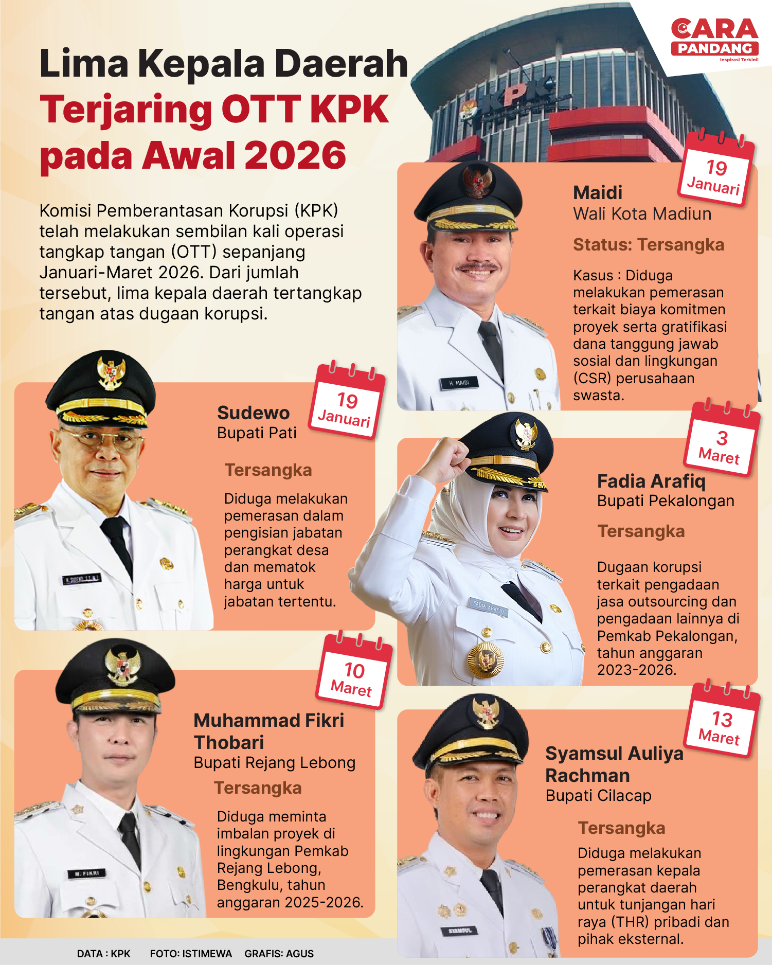 Beranda Infografis Lima Kepala Daerah Terjaring OTT KPK Awal 2026 Infografis Lima Kepala Daerah Terjaring OTT KPK Awal 2026 Penulis Amira Izzati - 15 Maret 2026 16:17 0 Lima Kepala Daerah Terjaring OTT KPK Awal 2026 Tags Berita Sebelumnya Wapres Gibran Ingatkan Pemudik Jaga Kesehatan dan Keselamatan dalam Perjalanan Berita Berikutnya Amarah dan Paku LEAVE A REPLY Cancel reply Comment: Please enter your comment! Name:* Please enter your name here Email:* You have entered an incorrect email address! Please enter your email address here Website: Save my name, email, and website in this browser for the next time I comment. Berita Teratas SIWO PWI Pusat Kecam Intimidasi Ofisial Malut United Terhadap Wartawan Tinjauan Ekonomi: Lonjakan Harga Minyak Global dan Gejolak Pasar, Dampak Ekonomi Serangan AS-Israel ke Iran Potret Timur Tengah: Israel Digempur Serangan Menengok Kompetisi Hobby Horsing di Warsawa, Polandia Nutrisi Buruk Pengaruhi Disregulasi Suasana Hati Pada Remaja Berita Terkait Berita Terkait Anak Dibawah 16 Tahun Dilarang Punya Medsos Obie - 11 Maret 2026 04:55 Pelatihan Vokasi Nasional 2026 Batch 1 Diperpanjang Obie - 09 Maret 2026 13:30 Kontak Darurat untiluk WNI di Timur Tengah Maliq - 04 Maret 2026 17:21 Kontak Darurat untuk WNI di Timur Tengah Obie - 04 Maret 2026 17:15