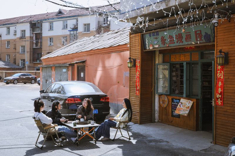 Ma Ruofan (pertama dari kanan) dan para pencinta buku menikmati kopi di luar Toko Buku Fanmo di Changchun, Provinsi Jilin, China timur laut, pada 15 April 2026. (Carapandang/Xinhua/Xu Chang)