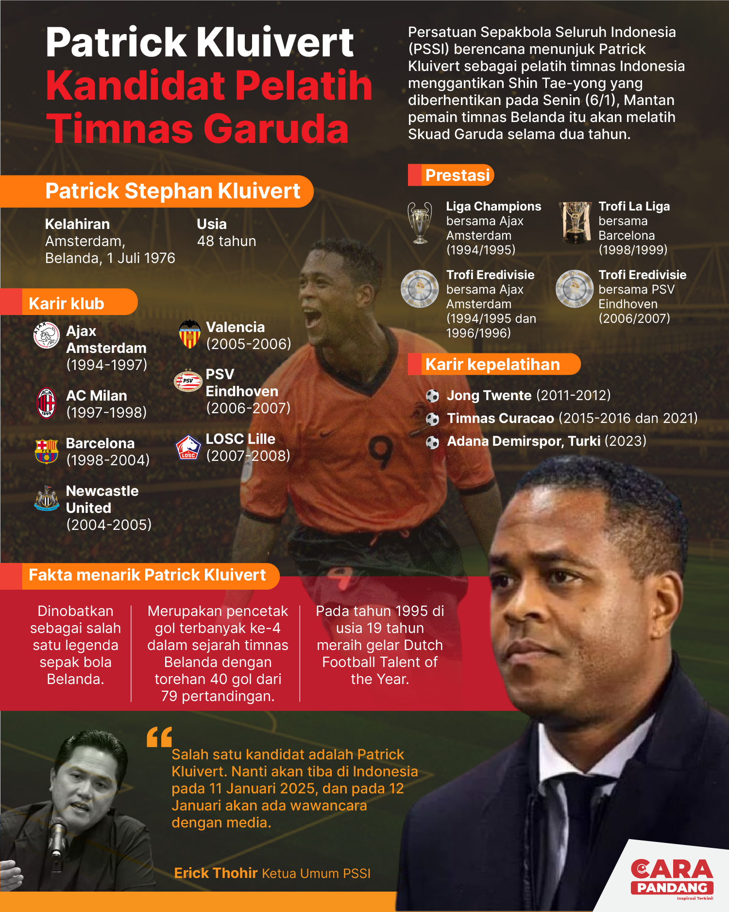 Dalam sebuah wawancaranya bersama media Belanda, De Telegraaf, Rabu, Kluivert memaparkan alasannya mengajak Pastoor karena pelatih 58 tahun itu cukup dekat dengannya.