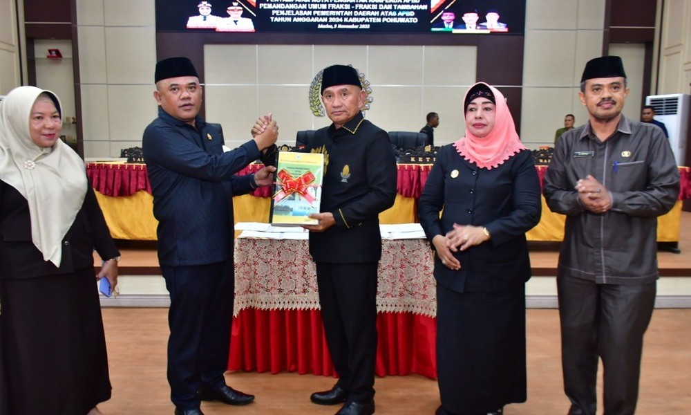 POHUWATO, CARAPANDANG - Bupati Pohuwato, Saipul A. Mbuinga telah menyerahkan dokumen Rancangan Anggaran Pendapatan dan Belanja Daerah Kabupaten Pohuwato tahun 2024 yang diterima Ketua DPRD Pohuwato, Nasir Giasi pada Rapat Paripurna ke-51 di ruang sidang DPRD Pohuwato, Kamis, (9/11/2023).