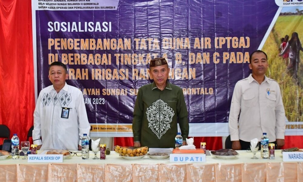 POHUWATO, CARAPANDANG.COM - Sosialisasi Pengembangan Tata Guna Air (PTGA) di berbagai tingkat A, B, dan C pada daerah irigasi Randangan yang berlangsung di aula Kantor Camat Patilanggio dibuka Bupati Pohuwato, Saipul A. Mbuinga, Kamis, (16/11/2023).