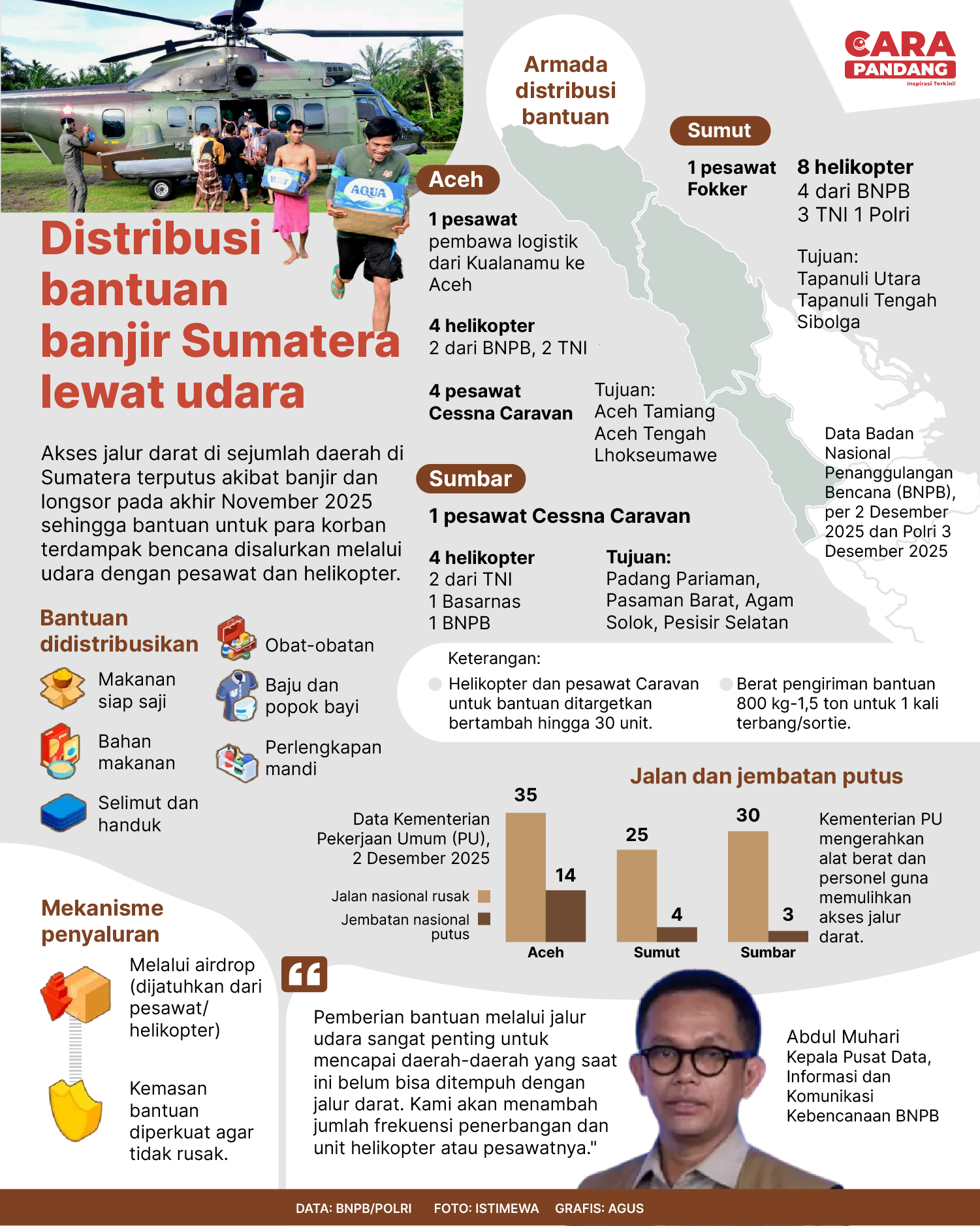 Beranda Infografis Distribusi Bantuan Banjir Sumatra Lewat Udara Infografis Distribusi Bantuan Banjir Sumatra Lewat Udara Penulis Amira Izzati - 06 Desember 2025 14:16 0 Distribusi Bantuan Banjir Sumatra Lewat Udara Tags Berita Sebelumnya Wakil Bupati Solok Tinjau Lokasi Jalan Putus di Nagari Lolo, Akses Warga Mulai Dipulihkan Berita Berikutnya Pasar Induk Kramat Jati Dilahap Si Jago Merah LEAVE A REPLY Cancel reply Comment: Please enter your comment! Name:* Please enter your name here Email:* You have entered an incorrect email address! Please enter your email address here Website: Save my name, email, and website in this browser for the next time I comment. Berita Teratas Menikmati Pesona Musim Gugur Hutan Belgrad di Istanbul, Turkiye Kanada Bidik Perluasan Kerja Sama Agrifood Dengan Indonesia Kemenkes Terjunkan Tenaga Medis ke Wilayah Bencana di Sumatra Delapan Emas Lahir dari Tim Indonesia pada Hari Ketiga Kemensos Lakukan Penanganan Bencana Banjir Sumatera Secara Berkesinambungan Berita Terkait Berita Terkait Dampak Banjir Aceh, Sumut dan Sumbar Zoel Rachman - 05 Desember 2025 08:47 Daftar Dosa Korupsi Netanyahu Zoel Rachman - 04 Desember 2025 12:52 Kutipan Pidato Hari Guru Nasional 2025 Maliq - 28 November 2025 12:12 Penyaluran Tunjangan Guru ASN Capai 92 Persen Zoel Rachman - 27 November 2025 08:56