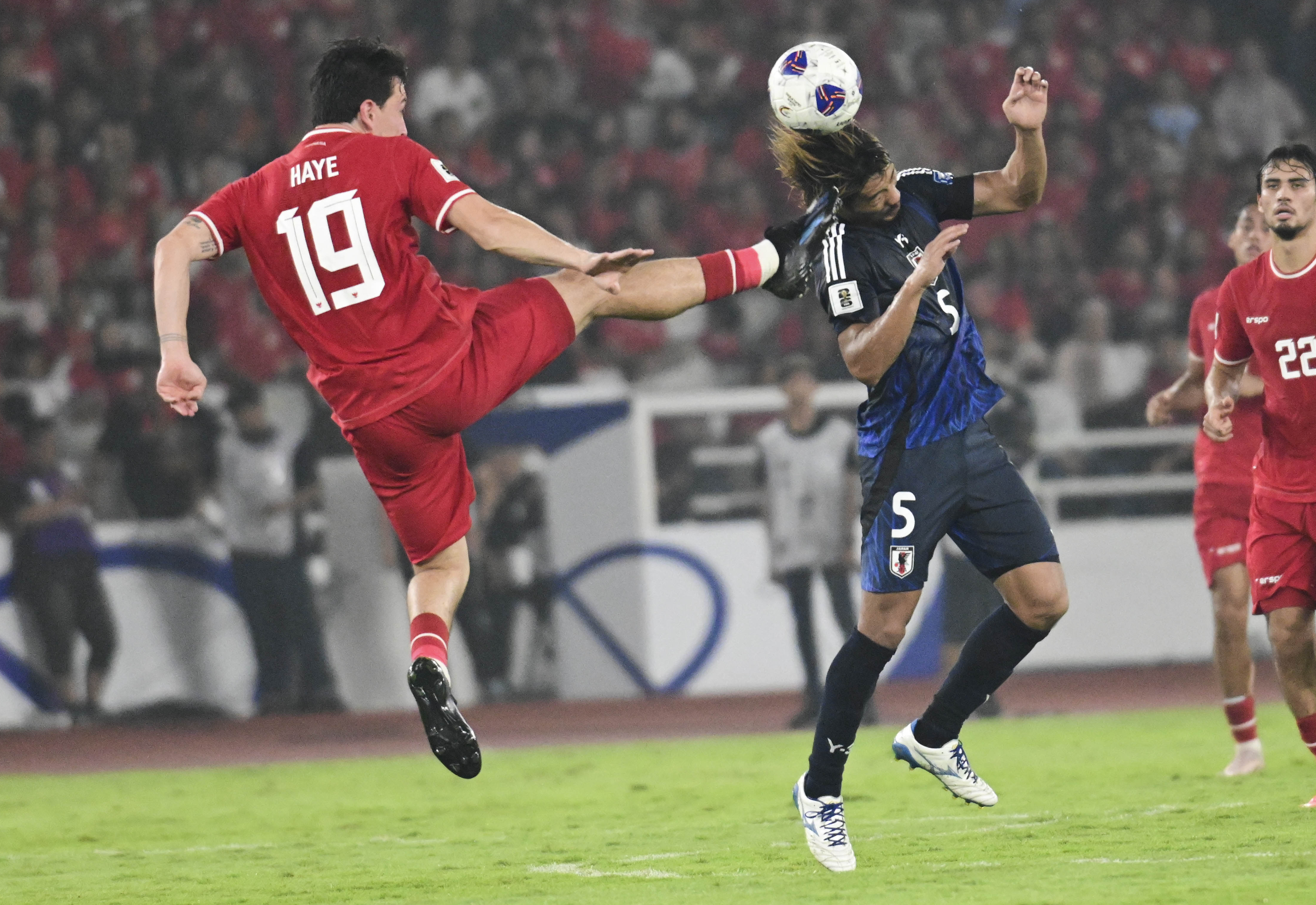 Pemain Jepang Ogawa Koki (kiri) beraksi dalam pertandingan Grup C Kualifikasi Piala Dunia FIFA 2026 Zona Asia antara Indonesia melawan Jepang di Stadion Gelora Bung Karno (GBK) di Jakarta pada 15 November 2024. (Xinhua/Agung Kuncahya B.)