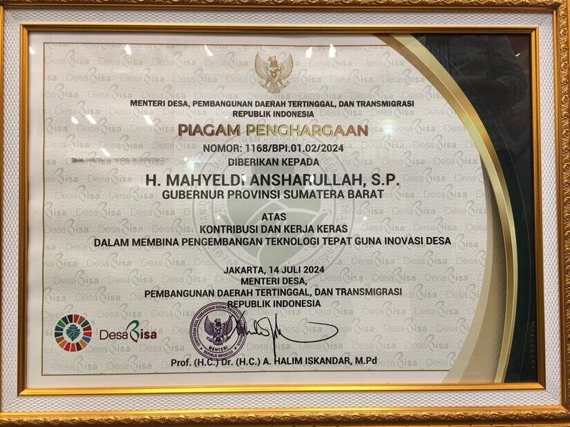 SUMBAR, CARAPANDANG - Gubernur Sumatera Barat (Sumbar), Mahyeldi Ansharullah, menjadi salah satu dari dua gubernur yang menerima Piagam serta Lencana Abdi Inovasi Desa dari Kementerian Desa dan Pembangunan Daerah Tertinggal dan Transmigrasi (Kemendes PDTT) RI. Penghargaan itu diraih berkat kontribusi dan kerja keras dalam membina pengembangan Teknologi Tepat Guna (TTG) Inovasi Desa di Sumbar.