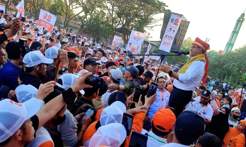 CARAPANDANG - Bakal calon presiden dari Koalisi Perubahan Anies Rasyid Baswedan menghadiri apel siaga dirangkaikan pengukuhan pengurus Dewan Pimpinan Ranting (DPRa) Partai Keadilan Sejahtera (PKS) sekaligus meresmikan posko induk pemenangan Konfederasi Nasional Relawan Anies (KoReAn) dalam safari politiknya di Makassar, Sulawesi Selatan.