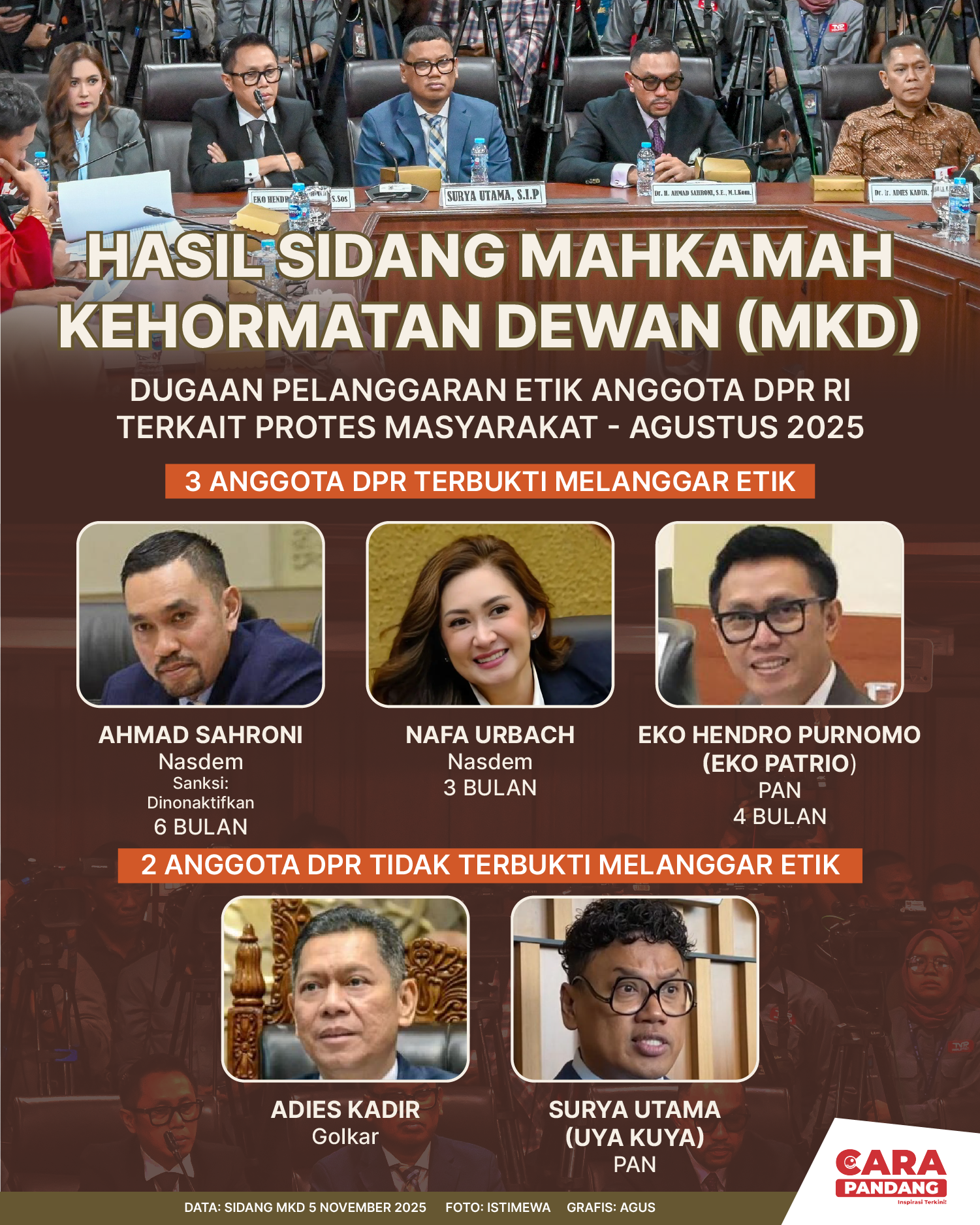 Beranda Infografis Hasil Sidang MKD DPR RI Infografis Hasil Sidang MKD DPR RI Penulis Amira Izzati - 06 November 2025 11:34 0 Hasil Sidang MKD DPR RI Tags Berita Sebelumnya Biaya Haji 2026 Turun Berita Berikutnya Perindagkop UKM Pohuwato Gelar Pasar Murah LEAVE A REPLY Cancel reply Comment: Please enter your comment! Name:* Please enter your name here Email:* You have entered an incorrect email address! Please enter your email address here Website: Save my name, email, and website in this browser for the next time I comment. Berita Teratas Cara Tidur Ala Rasulullah, Bagus untuk Kesehatan! Piala Dunia U-17, Nova Arianto Berharap Qatar Kembali Bersahabat Kiat Mempertahankan Nutrisi Makanan Saat Memasak Menggunakan Microwave Hadapi Liverpool di UCL, Xabi Alonso Sebut Laga Besar dan Klasik Pabrik Mobil Terbang Pertama di Dunia Mulai Uji Coba Produksi di China Selatan Berita Terkait Berita Terkait Biaya Haji 2026 Turun Maliq - 06 November 2025 11:32 Indonesia Para Badminton, Tradisi Juara Umum Berlanjut Maliq - 05 November 2025 09:37 Jadwal Indonesia di Piala Dunia U17 2025 Maliq - 29 Oktober 2025 13:24 Whoosh Indonesia vs Land Brigde Arab Saudi Maliq - 27 Oktober 2025 12:18