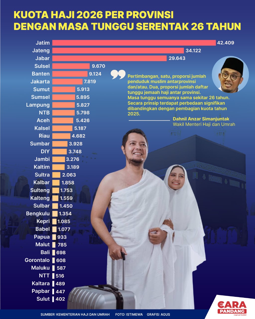 Beranda Infografis Kuota Haji 2026 per Provinsi, Masa Tunggu 26 Tahun Infografis Kuota Haji 2026 per Provinsi, Masa Tunggu 26 Tahun Kuota Haji 2026. Penulis Edo Soeryadi - 23 November 2025 09:37 0 CARAPANDANG.COM - Kuota Haji 2026. Tags Infografik Haji 2026 Berita Sebelumnya Trump Tetapkan Tenggat Waktu Penerimaan Rencana Perdamaian Ukraina yang Diusulkan AS Berita Berikutnya Pasar Induk Kramat Jati Dilahap Si Jago Merah LEAVE A REPLY Cancel reply Comment: Please enter your comment! Name:* Please enter your name here Email:* You have entered an incorrect email address! Please enter your email address here Website: Save my name, email, and website in this browser for the next time I comment. Berita Teratas Menikmati Pesona Musim Gugur Hutan Belgrad di Istanbul, Turkiye Kanada Bidik Perluasan Kerja Sama Agrifood Dengan Indonesia Kemenkes Terjunkan Tenaga Medis ke Wilayah Bencana di Sumatra Delapan Emas Lahir dari Tim Indonesia pada Hari Ketiga Kemensos Lakukan Penanganan Bencana Banjir Sumatera Secara Berkesinambungan Berita Terkait Berita Terkait Distribusi Bantuan Banjir Sumatra Lewat Udara Maliq - 06 Desember 2025 14:16 Dampak Banjir Aceh, Sumut dan Sumbar Zoel Rachman - 05 Desember 2025 08:47 Daftar Dosa Korupsi Netanyahu Zoel Rachman - 04 Desember 2025 12:52 Kutipan Pidato Hari Guru Nasional 2025 Maliq - 28 November 2025 12:12