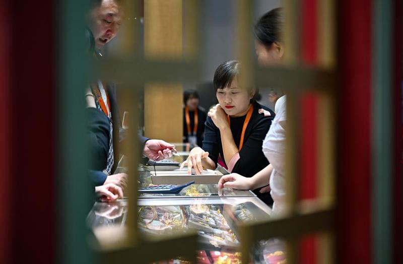 Sejumlah pengunjung memilih perhiasan emas dalam Pameran Produk Konsumen Internasional China (China International Consumer Products Expo/CICPE) keempat di Haikou, ibu kota Provinsi Hainan, China selatan, pada 17 April 2024. (Xinhua/Guo Cheng)