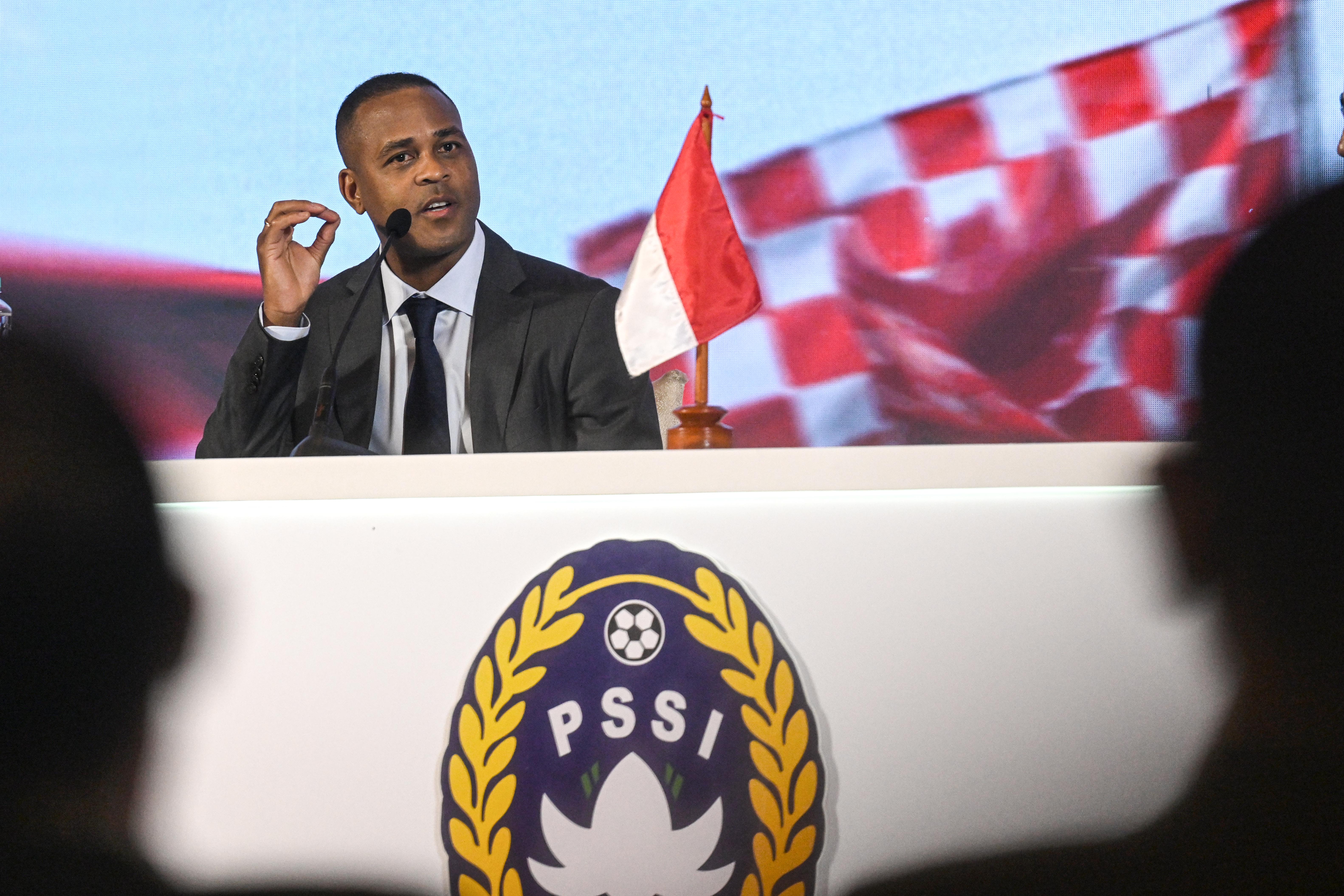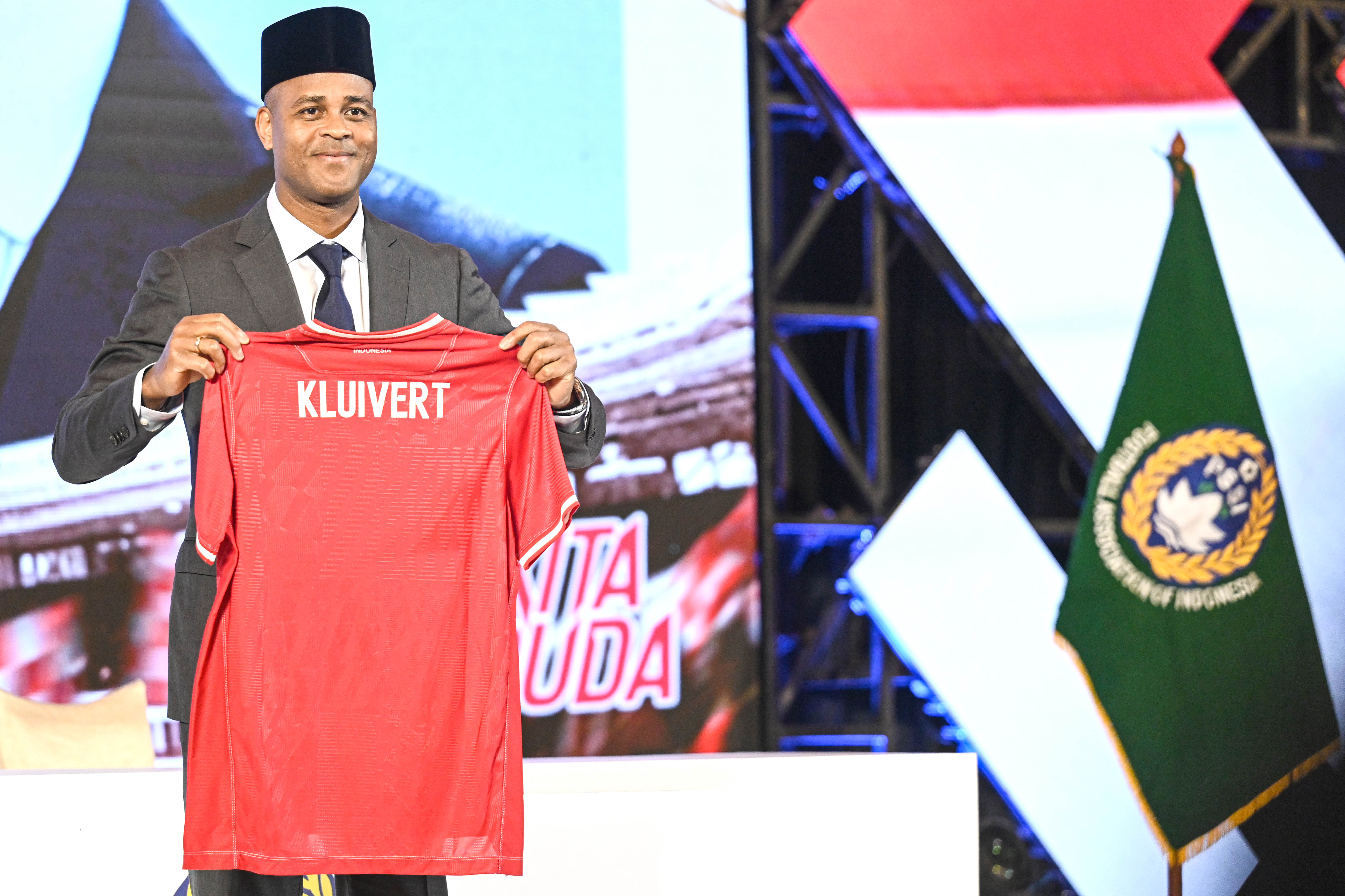 Mantan pemain tim nasional (timnas) Belanda yang baru saja ditunjuk menjadi pelatih kepala tim nasional sepak bola putra Indonesia, Patrick Kluivert, menunjukkan jersey bertuliskan namanya dalam konferensi pers di Jakarta pada 12 Januari 2025.
