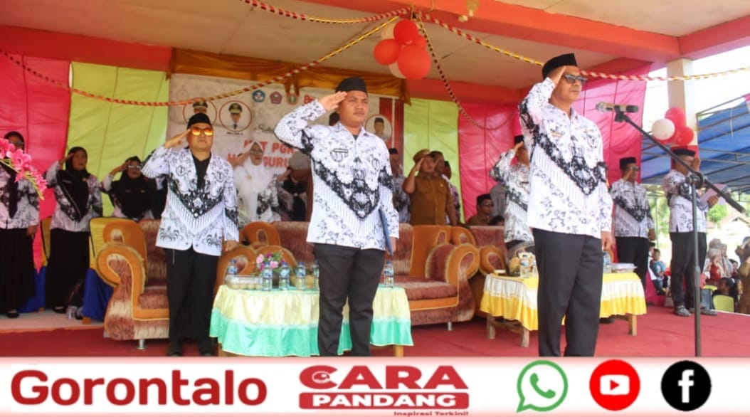 POHUWATO, CARAPANDANG - Pemerintah Kecamatan Taluditi bersama jajaran guru se-Kecamatan Taluditi menggelar upacara memperingati Hari Ulang Tahun (HUT) ke-80 Persatuan Guru Republik Indonesia (PGRI) sekaligus Hari Guru Nasional (HGN) di lapangan Desa Kalimas, Selasa (25/11/2025).