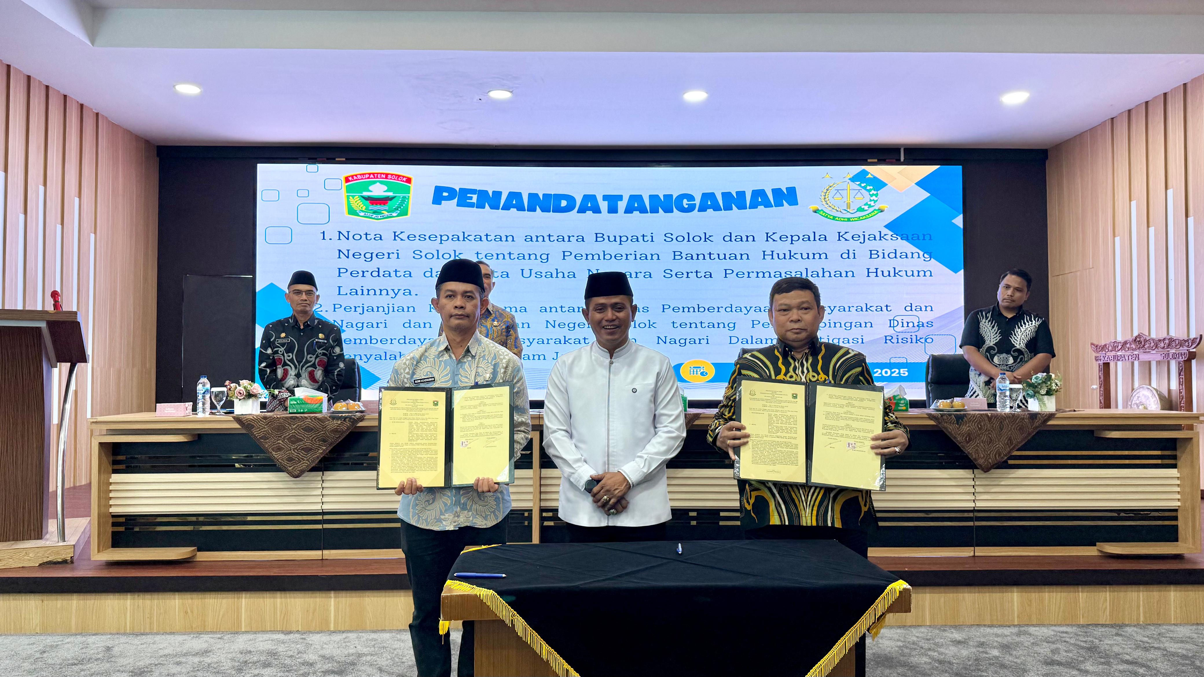SOLOK, CARAPANDANG - Pemerintah Kabupaten Solok bersama Kejaksaan Negeri Solok menandatangani Nota Kesepakatan dan Perjanjian Kerja Sama terkait pemberian bantuan hukum di bidang perdata, tata usaha negara, serta pembimbingan dalam program Jaga Nagari. Kegiatan ini berlangsung di Aula Gedung C, Sekretariat Daerah Kabupaten Solok, pada Jumat(03/10/2025).