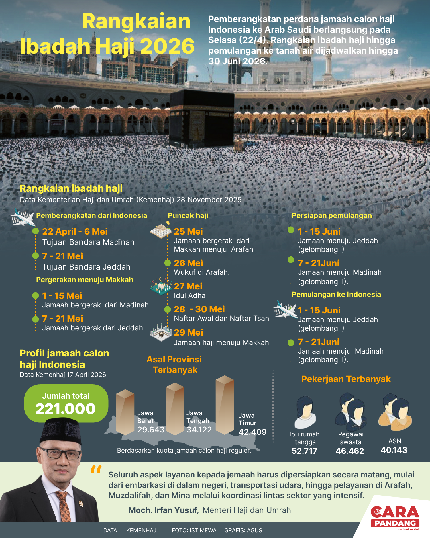 Beranda Infografis Rangkaian Ibadah Haji 2026 Infografis Rangkaian Ibadah Haji 2026 Penulis Amira Izzati - 25 April 2026 16:05 0 Rangkaian Ibadah Haji 2026 Tags Berita Sebelumnya Aliansi Rakyat Merdeka Siap Berunjuk Rasa Pada Peringatan 1 Mei Berita Berikutnya 54.604 Jemaah Haji Telah Diberangkatkan ke Tanah Suci LEAVE A REPLY Cancel reply Comment: Please enter your comment! Name:* Please enter your name here Email:* You have entered an incorrect email address! Please enter your email address here Website: Save my name, email, and website in this browser for the next time I comment. Berita Teratas Menkeu Purbaya: Tegaskan Tak Ada Rencana Pajak Kapal di Selat Malaka Trump: Penembakan di Acara Makan Malam Tak Akan Ganggu Perang Lawan Iran Kisah Teladan: Utsman bin Affan r.a. Sahabat Nabi yang Kaya Raya dan Sangat Dermawan Hindari dan Saling Jaga: 9 Alasan Pisah, yang Paling Sering Terjadi Bukan Cuma karena Tidak Cinta! Piala Wakil Walikota, Ajang Bergengsi Bekasi Menuju Kota Sport City Berita Terkait Berita Terkait Kuliah S1/D4 untuk Guru, Lebih Ringan dengan Skema RPL Maliq - 27 April 2026 15:20 Komoditas Terdampak Penutupan Selat Hormuz Maliq - 24 April 2026 19:09 Penjaringan Data Guru Tertentu Belum Bersertifikat Pendidik Tahun 2026 Maliq - 24 April 2026 15:18 Menilik Isi UU Perlindungan Pekerja Rumah Tangga Zoel Rachman - 24 April 2026 09:47
