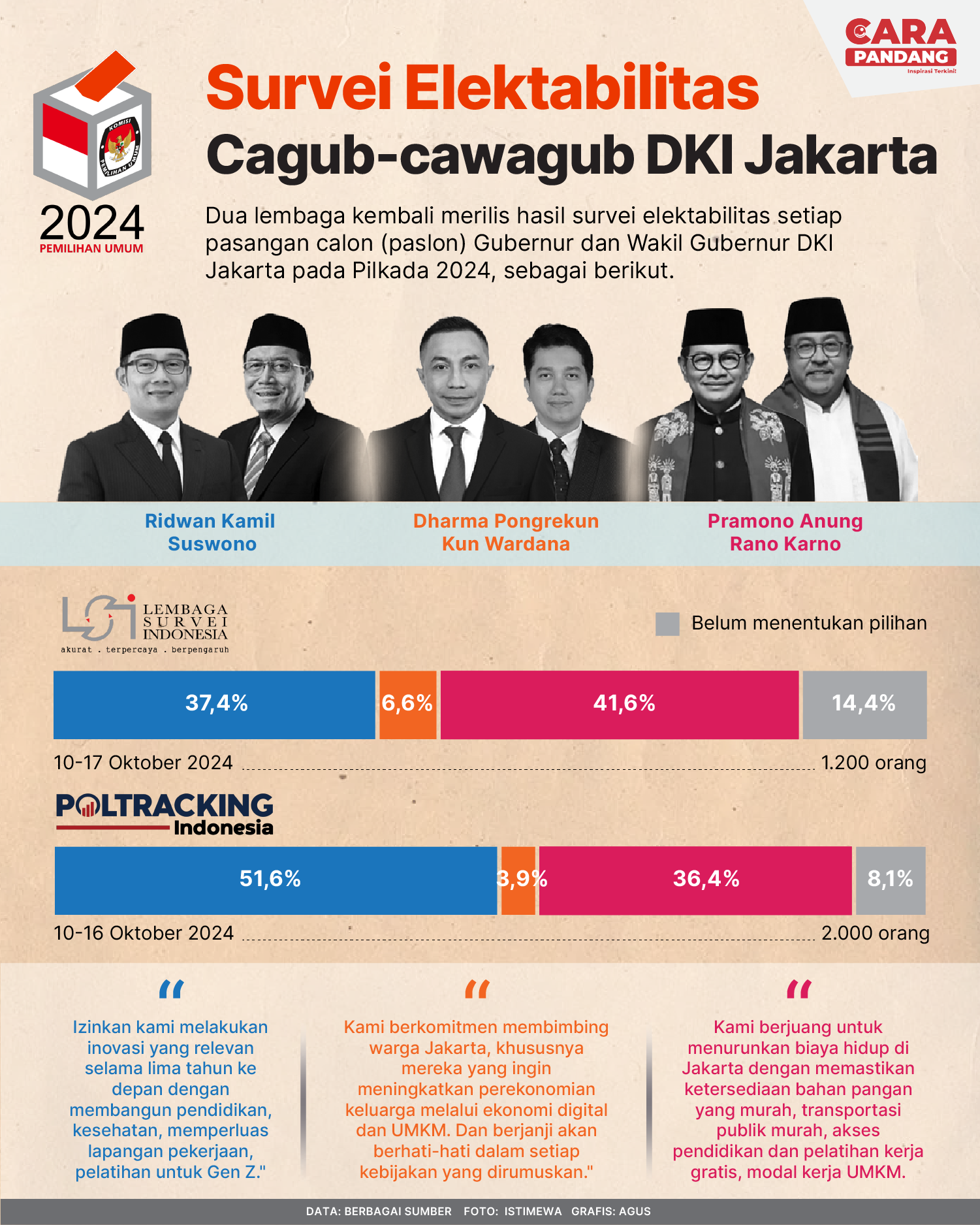 Berikut hasil survei elektabilitas Pilkada Jakarta 2024 yang sejauh ini dirilis Poltracking dan Lembaga Survei Indonesia (LSI).