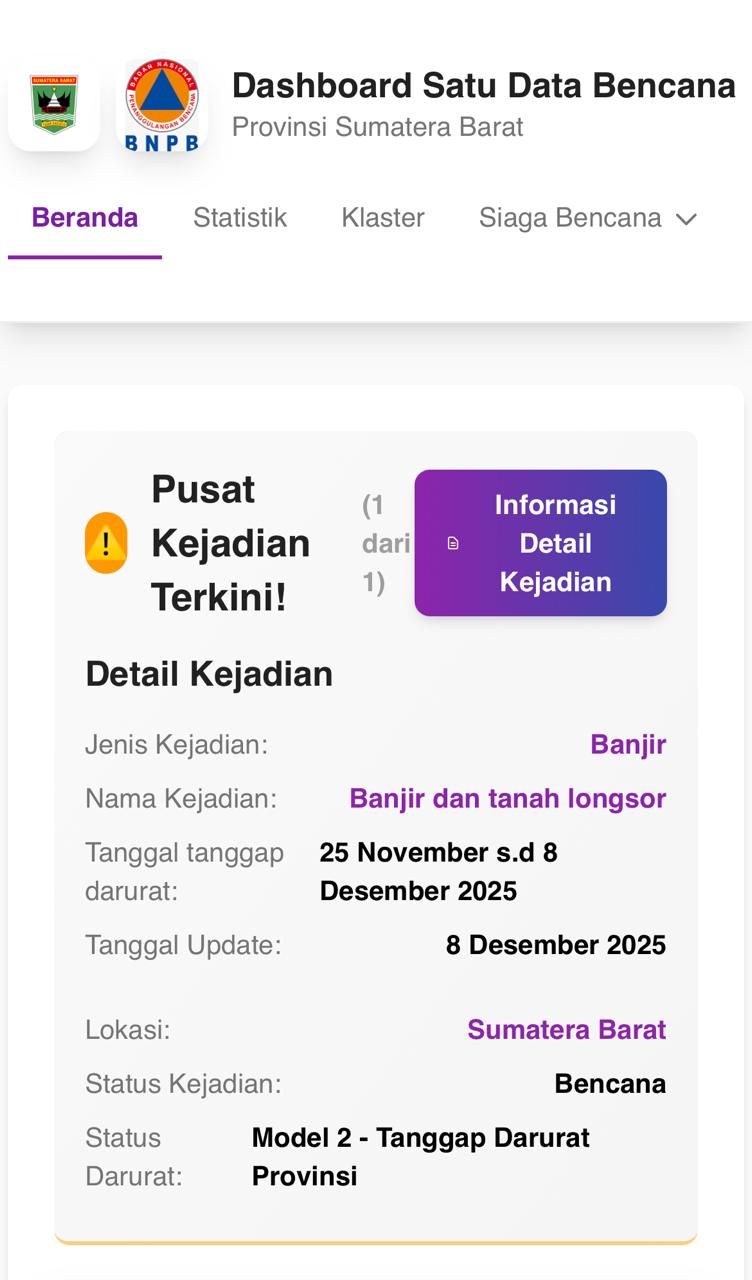 SUMBAR, CARAPANDANG - Pemerintah Provinsi Sumatera Barat (Pemprov Sumbar) melalui Website Dashboard Satu Data Bencana kembali merilis data terbaru korban bencana hidrometeorologi, per Senin (8/12) pukul 18.00 WIB.
